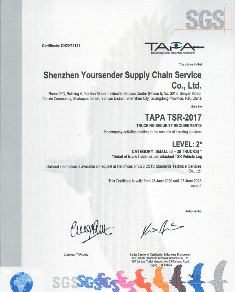 在目前全球贸易扩张的情况下,各种犯罪也不断深入到物流供应链。过去的时间里,各种环境法规不断增加,而组织也越来越注重其在全球供应链中的安全问题。有信达TAPA TSR年审通过,展现了有信达在货车运输安保标准中始终保持较高水平,符合国际标准,安全稳定。有信达也始终保持着“应需而达,高效无忧”的企业使命,为客户和合作伙伴提供更优的服务!欢迎更多伙伴的加入!